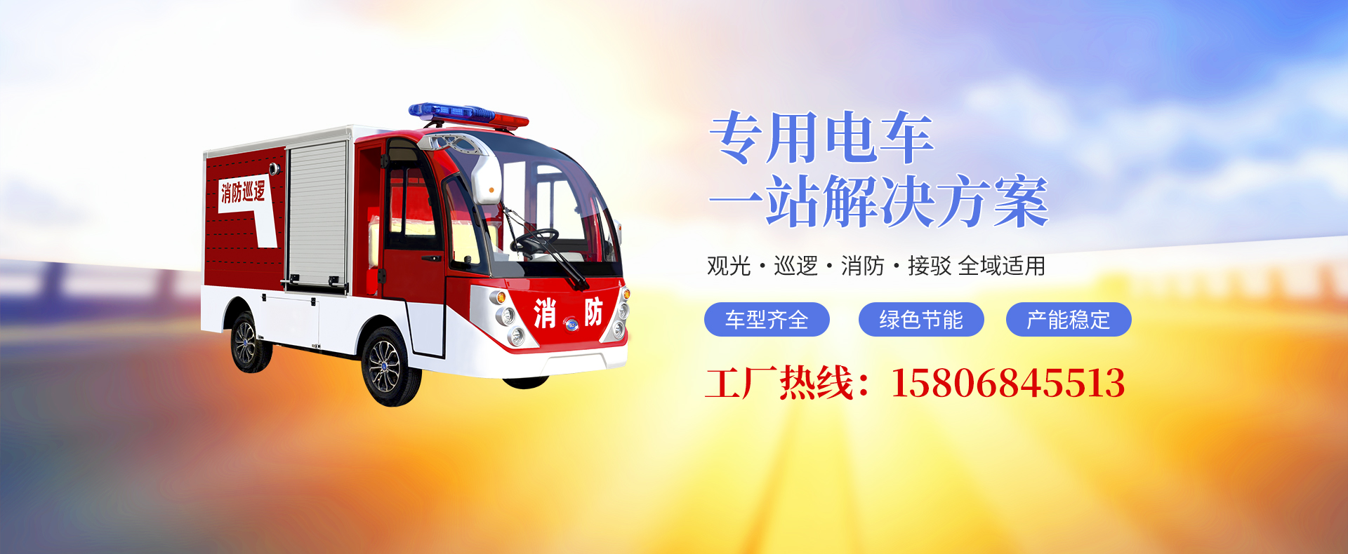 生产经营的车型有:电动旅游观光车、高尔夫球车、电动厂区巡逻车、电动微型消防车、电动豪华老爷车、电动封闭送餐车及电动货车等六大系列,二十多款非公路用电车,产品畅销全国各地,广泛应用于旅游景点、小区物业、等领域。